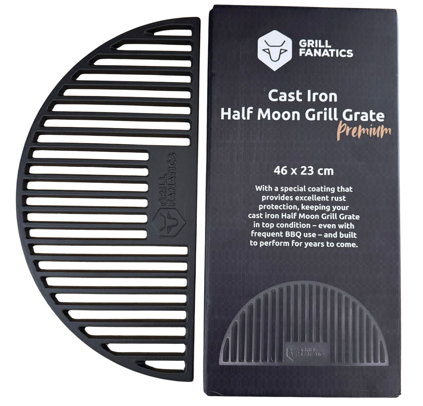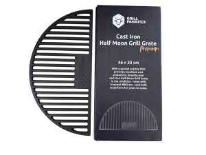 The Grill Fanatics cast iron half-moon grill grate is designed for direct grilling with intense grill marks and maximum flavor.
