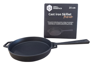 The Grill Fanatics Cast Iron Skillet 25 cm is a versatile cast iron pan with a removable handle, perfect for BBQ use, the oven, and open fire. It provides even heat distribution and powerful cooking results.