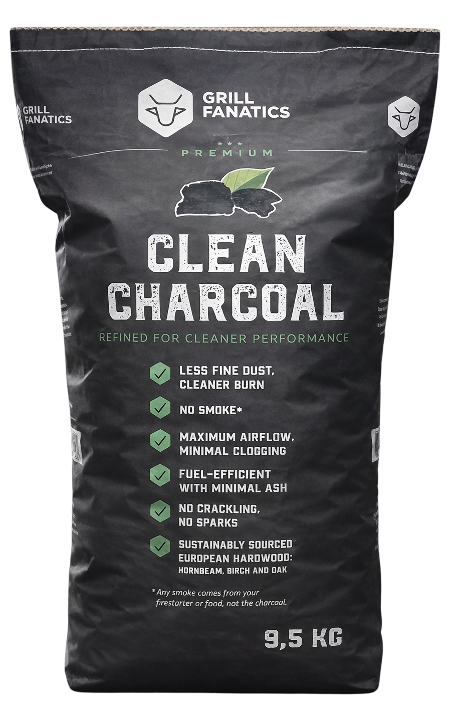 Grill Fanatics Clean Charcoal is premium charcoal made from FSC-certified European hardwood. Thanks to its high carbon content, this charcoal burns powerfully, for a long time and more cleanly, with less smoke and minimal ash formation.
