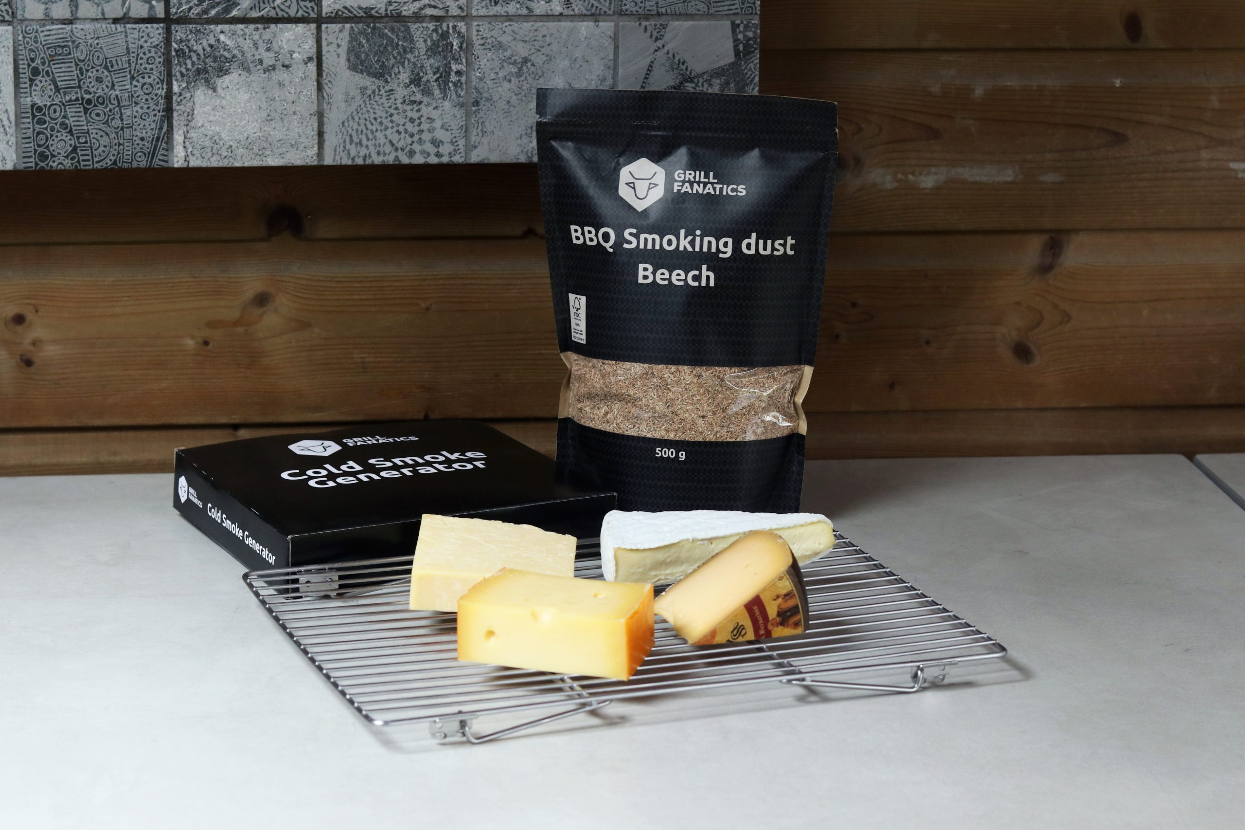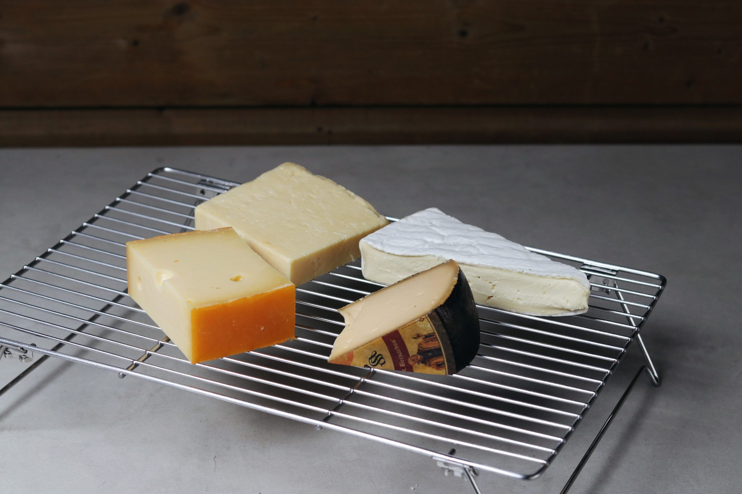 Begin een dag van te voren met de voorbereidingen voor het koud roken van de kaas door je kaasjes uit te pakken en op een (taart)rooster te leggen. Ik ging voor een stuk brie, een witte cheddar, een St. Bernardus bierkaas en een stuk belegen kaas.
